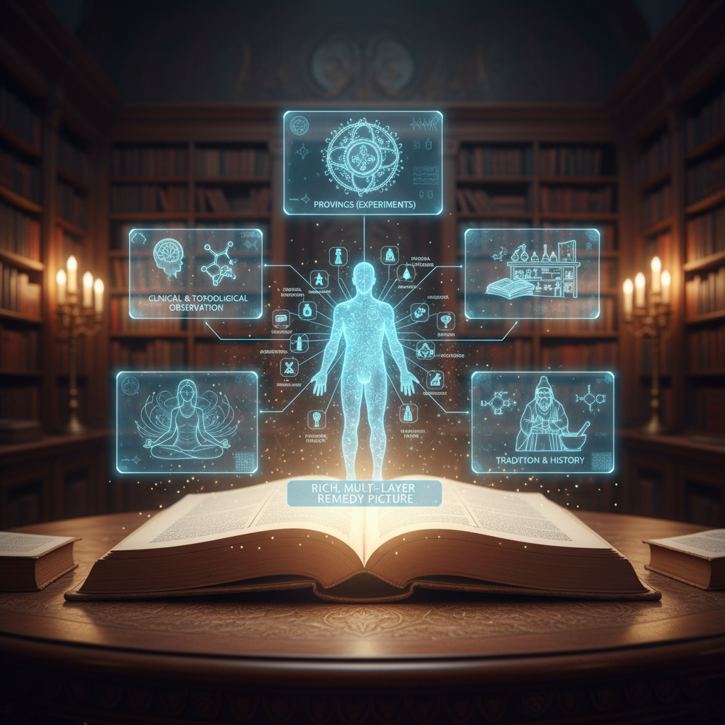 Materia Medica vzniká kombinací experimentů (provingů), pozorování (toxikologie, klinika) a tradice, a proto každý lék obsahuje bohatý, mnohovrstevný obraz.