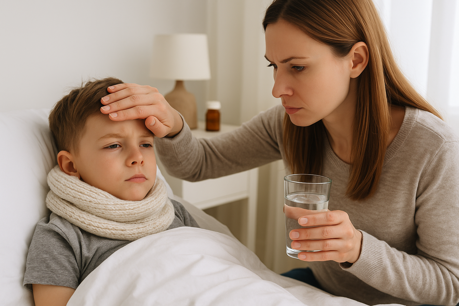 Dítě (6 let) náhle onemocní – večer se objeví horečka 39,5 °C, horká červená tvář, rozšířené zorničky, lesklé oči, pulzující bolest hlavy, neklid, citlivost na světlo a hluk.